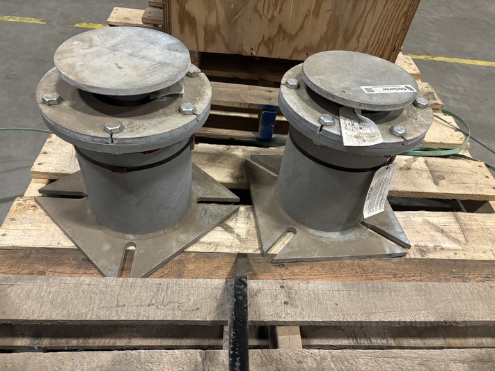 Both spring hangers are unused and uninstalled, stored on pallets since receipt. Factory load blocking is still in place. Exterior surfaces show only light handling dust consistent with warehouse storage. Identification tags, load scales, and certification paperwork remain intact.