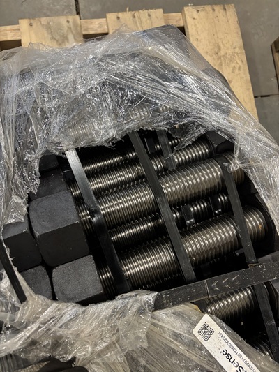 All fasteners are unused and uninstalled, stored palletized and protected with shrink wrap. Threads are clean and undamaged. No evidence of installation, loading, or service exposure. Packaging labels remain legible.
