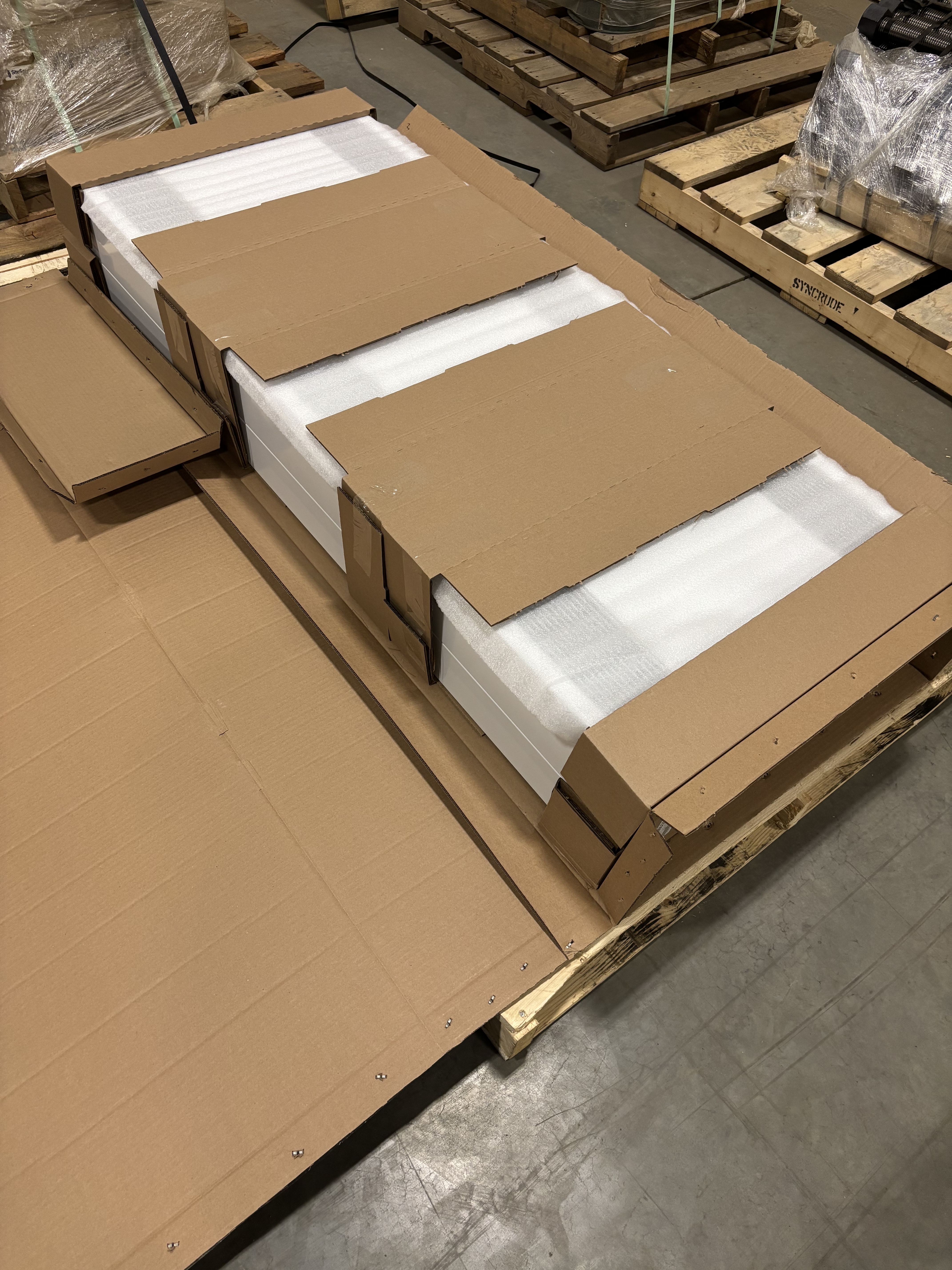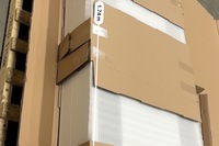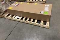 The heater is unused and uninstalled, stored in its original packaging and palletized. Box has been opened for inspection only. Heater casing, elements, and fan assembly show no signs of installation or operation. Minor handling marks on packaging only.