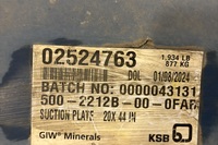 GIW/KSB suction plate, size 20X44, complete with factory labeling and full batch identification. Surfaces show light storage wear only, with no structural defects or deformation. This unit is fully traceable and suitable for slurry pump rebuilds or operations requiring documented provenance.